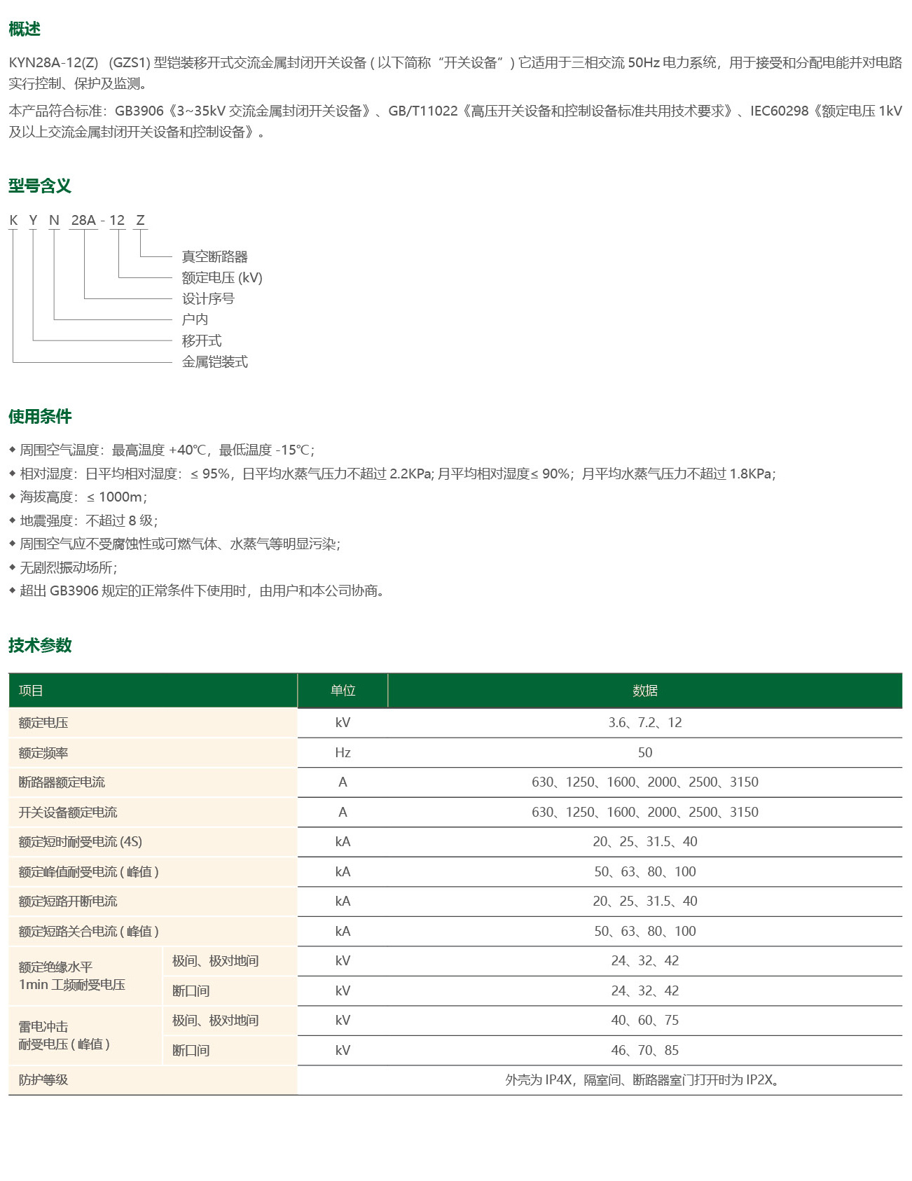 KYN28A-12(Z)(GZS1)型铠装移开式交流金属封闭开关设备(以下简称"开关设备”)它适用于三相交流50Hz电力系统,用于接受和分配电能并对电路实行控制、保护及监测。本产品符合标准:GB3906《3~35kV交流金属封闭开关设备》、GB/T11022《高压开关设备和控制设备标准共用技术要求》、IEC60298《额定电压1kV及以上交流金属封闭开关设备和控制设备》