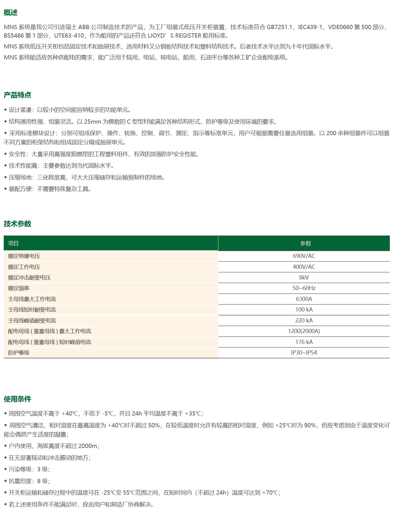 MNS系统是我公司引进瑞士ABB公司制造技术的产品,为工厂组装式低压开关柜装置,技术标准符合GB7251.1,IEC439-1,VDE0660第500部分BS5486第1部分,UTE63-410,作为船用的产品还符合LIOYD'SREG1STER船用标准。